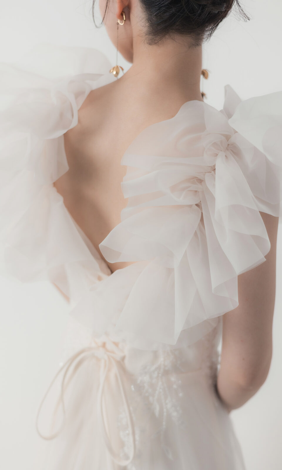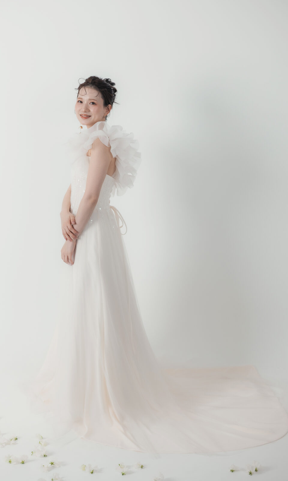 肩にあしらわれた軽やかなフリルがお顔周りをふんわりと彩り、